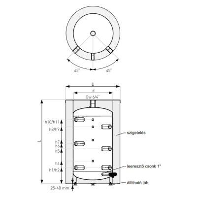• A csatlakozások a puffertartály elejétől jobbra és balra 45º-os szögben helyezkednek el