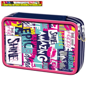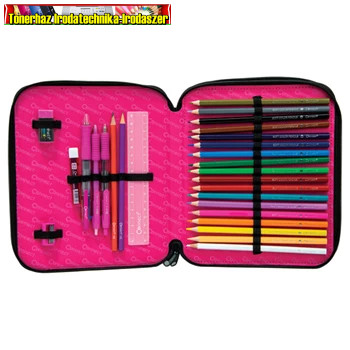 Egyrészes, írószerrel töltött, cipzáras tolltartó. Belül nyomott mintás textillel bevont merev lapokkal, gumis kialakítással az írószerek tárolásához.