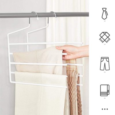 • Amit kap: 4 darab többszörös nadrágtartó fogast, amelyek mindegyike 5 rúddal rendelkezik. Ezekkel a fogasokkal rendezetten és átláthatóan tárolhatja nadrágjait és sáljait, miközben maximalizálja a helyet a szekrényben. A ruhái hálásak lesznek érte!