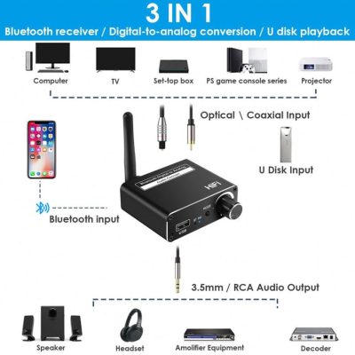 Ez a termék számos funkcióval rendelkezik, többek között Bluetooth vevővel, digitális-analóg, U Disk lejátszó és minden az egyben audio konverterrel. Támogatja az okostelefon zenéinek vagy FM rádiójának vezeték nélküli jeleinek vételét. Támogatja az SPDIF (Toslink, Optikai) sztereó analóg 3,5 mm-es R/L jack csatlakozóval történő konvertálását is. Automatikusan felismeri és olvassa az U Disk zenéit, például WAV és MP3 formátumot. Alkalmas HDTV-hez, játékkonzolokhoz, CD-lejátszókhoz. Tökéletesen megoldja az audioeszközök vagy -eszközök korlátait.