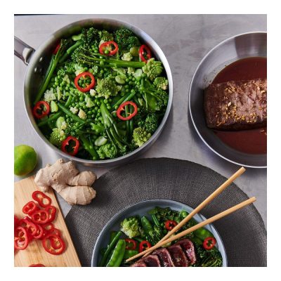 A de Buyer Alchimy 28 cm-es magas falú serpenyője tökéletes választás nagyobb adagok és szaftos ételek elkészítéséhez. A háromrétegű rozsdamentes acél kialakítás precíz hőszabályozást és egyenletes hőelosztást biztosít, míg a 4,5 literes kapacitás lehetővé teszi a sokoldalú használatot.
