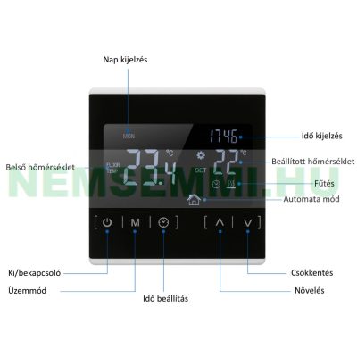 Digitális érintőképernyős termosztát elektromos padlófűtéshez 16A fehér-fekete