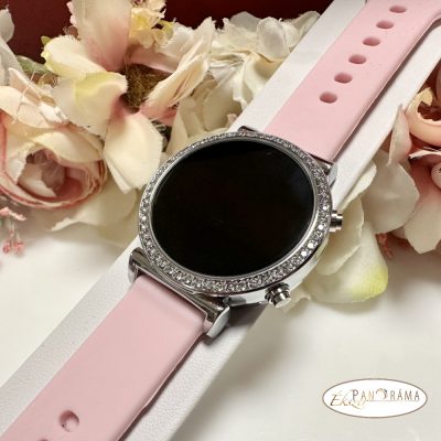 • Digitális karóra , női, kör alakú, ezüst színű kristályos tokkal, rózsaszín szilikon szíjjal