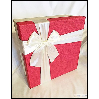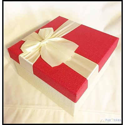 Igényes kartondoboz textil mintázattal.lja krém szín, teteje piros és egy selyem krém masni díszíti. Bélése pözttyes. Lakásunk díszítésére, tárolásra, vagy az ajándékunk átadására is tökéletes darab!
