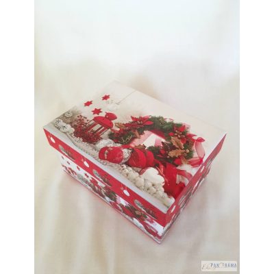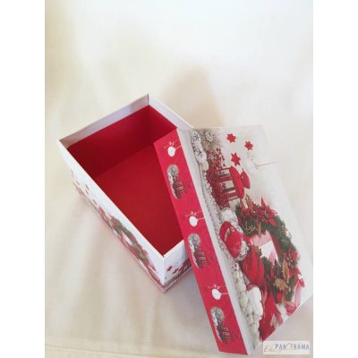 Karácsonyi mintázatú díszdoboz ajándéknak, édességnek, apróságoknak kiválóan alkalmas. Egy szép masnival fel lehet dobni és már kész is a csomagolás!