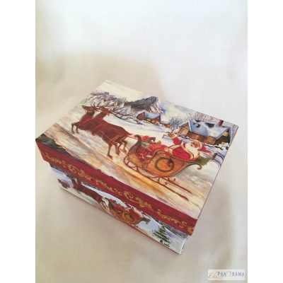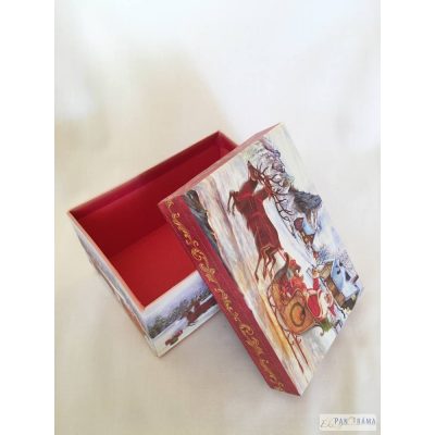 Karácsonyi mintázatú díszdoboz ajándéknak, édességnek, apróságoknak kiválóan alkalmas. Egy szép masnival fel lehet dobni és már kész is a csomagolás!