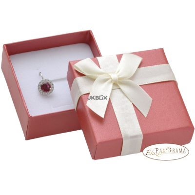 Piros színű papírdoboz tetején krém színű szalag díszítéssel, fülbevalós szettek, medálos láncok számára