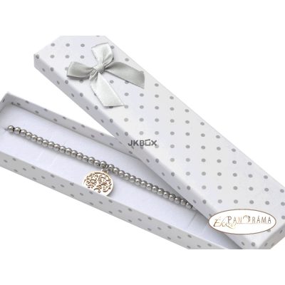 Fehér színű papírdoboz tetején ezüst masni díszítéssel, karkötők , láncok számára.