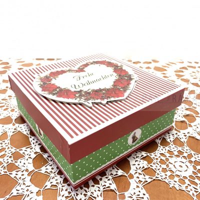 Karácsonyi mintázatú díszdoboz ajándéknak, édességnek kiválóan alkalmas. Csak beletesszük az ajándékot és már kész is a csomagolás!