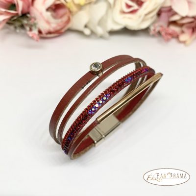 Divatos bőrhatású karkötő strasszokkal, mágnes zárral - Red