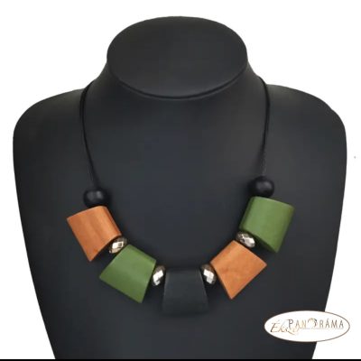 Minden évszakban feldobhatja ruhatárát ezzel az ízléses nyakékkel. Színes fa elemekkel, arany színű betéttel, szerelékkel eleganciát sugároz!
