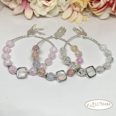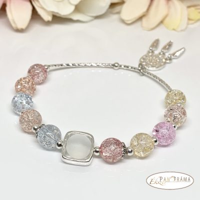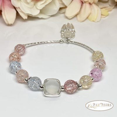 Ezüst színű alapon divatos karkötő, pasztell színű roppantott kristályokkal.