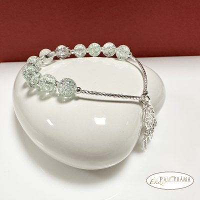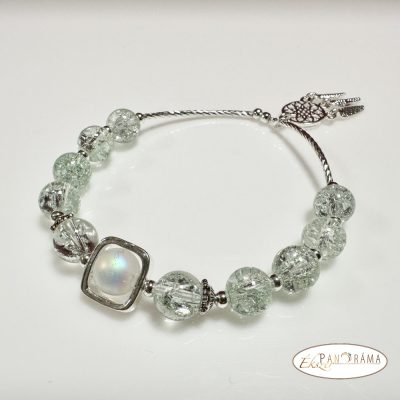 Ezüst színű alapon divatos karkötő, pasztell színű roppantott kristályokkal. Rugalmas, egyik oldal közepén egy nagyobb kristállyal, másik oldalon trendi motívumokkal díszítve.
