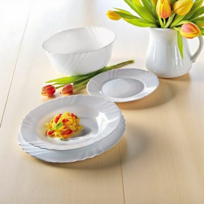 Az Ebro étkészlet ideális választás mindennapi használatra és különleges alkalmakra egyaránt. A 19 részes készlet kiváló minőségű opál üvegből készült, amely nemcsak elegáns megjelenést biztosít, hanem rendkívüli tartósságot és könnyű kezelhetőséget is.