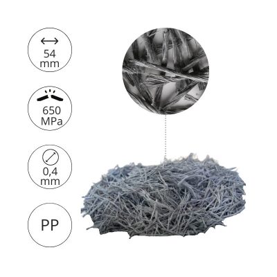 • Az Eco Twist 54 100% tisztaságú (nem újrahasznosított) kopolimer polipropilénből készült, sodrott monofil szálkötegekből áll, ipari padló alkalmazásokban a szerkezeti beton megerősítésére használjuk.