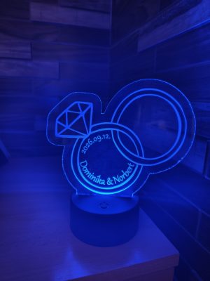 Egyedi LED plexi lámpánk elegáns 2 gyűrű motívummal készül, amely az örök összetartozást szimbolizálja. A lámpa felületébe gravírozzuk a megadott nevet és dátumot, így igazán személyes és maradandó ajándék válik belőle. Modern LED technológiájának köszönhetően hangulatos fényt ad, amely nemcsak dísze lehet az esküvői dekorációnak, hanem később a közös otthon romantikus kiegészítőjeként is szolgál. Tökéletes választás nászajándéknak, esküvői meglepetésnek vagy évfordulós ajándéknak. Egyedi gravírozással minden lámpa különleges és megismételhetetlen, így igazán személyre szabott módon fejezi ki a szeretetet és az emlékezést a nagy napra.