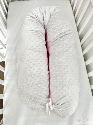 A Love kismamapárna minden szálában benne van a gondoskodás – legyen szó a kismama kényelméről vagy a baba biztonságáról. Egyik oldala gyengéd rózsaszín 100% pamutvászon, a másik pedig puha, meleg tapintású világosszürke minky anyag, így használat közben mindig választhatsz, melyik felület illik jobban az adott helyzethez.