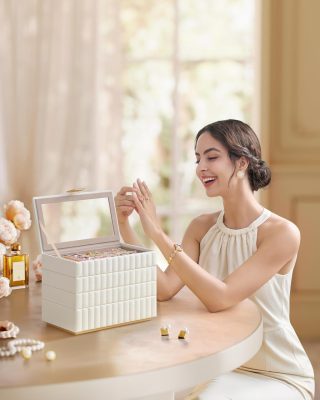 【TELJES VÉDELEM】Masszív MDF vázból és víz- és kopásálló külső felületből készült, amely könnyen tisztítható. Ez az ékszertároló lebegő alappal tartós védelmet nyújt. Puha bársonybélése megóvja ékszereit a karcolásoktól.