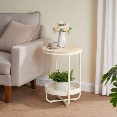 Egyszerű, klasszikus kerek dohányzóasztal lyukas dizájnkosárral, könnyen összeilleszthető a különböző stílusú bútorokkal bézs színben
