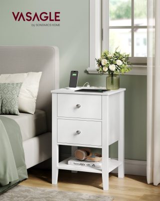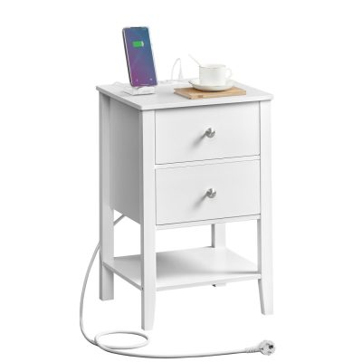 Éjjeliszekrény Bambuszból, Oldalsó Asztal Töltési Funkcióval, 2 Fiókkal, Nyitott Polccal, 2 USB-A Csatlakozóval, 2 AC Csatlakozóval, Minimalista, Nappaliba, Hálószobába, Kanapé Mellé, Felhőfehér: