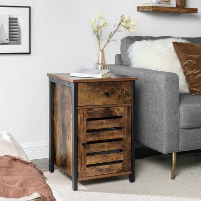 éjjeliszekrény fiókkal, végasztal tárolóval, redőnyajtóval, hálószoba oldalsó asztal, nappali, fém keret, ipari stílus, rusztikus barna és fekete: