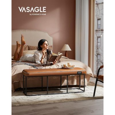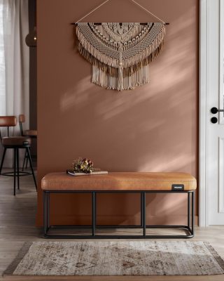 EKHO Collection - Előszoba hálószoba pad, PU varrással, acélkeret, nappali étkező, századközép modern, 300 kg kapacitás, karamellbarna: