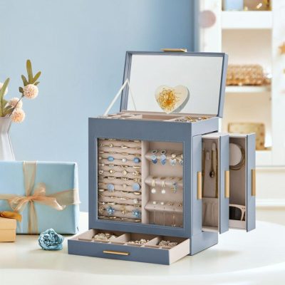ékszerdoboz üvegablakkal, 5 rétegű rendszerező 3 oldalsó fiókkal, függőleges tárolóhellyel, nagy tükörrel, modern stílusban füstös kék és arany: