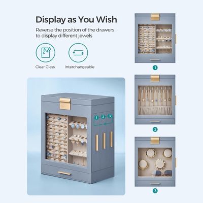 • [Cserélhető oldalfiókok] A 3 oldalsó fiók helyzete változtatható, hogy tetszés szerint különböző ékszereket állíthasson elő. Értékeit pedig pormentesen tartja ennek az ékszerdoboznak az átlátszó üvegablaka mögött!