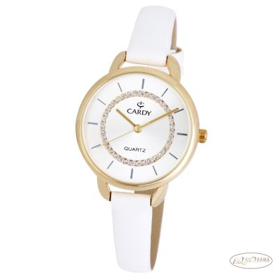 Ékszeróra bőr szíj, arany tok, Cardy női - fehér kristályos