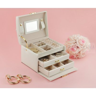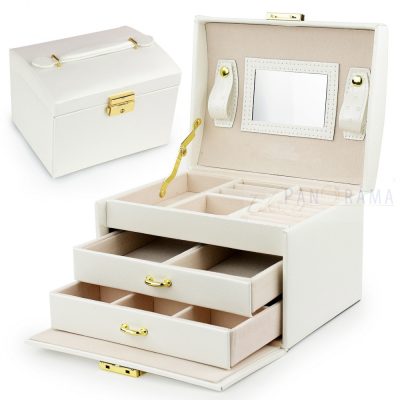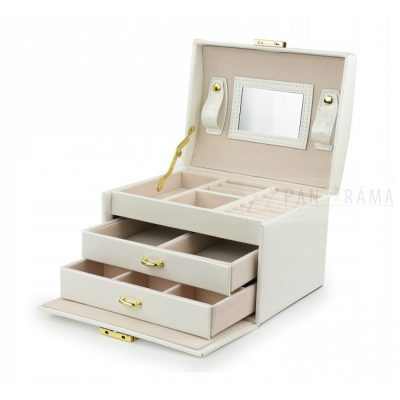 Divatos, elegáns, praktikus, nőies, több rekeszes, , fiókos ékszerdoboz, tükörrel. Kulccsal zárható.