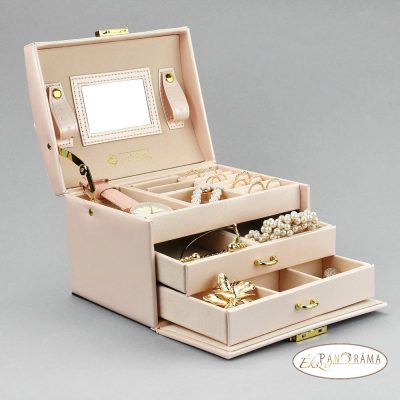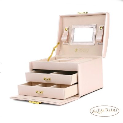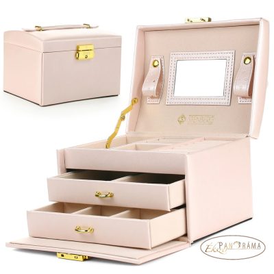 Divatos, elegáns, praktikus, nőies, több rekeszes, , fiókos ékszerdoboz, tükörrel. Kulccsal zárható.
