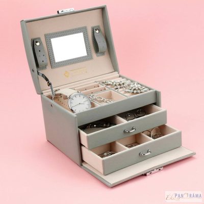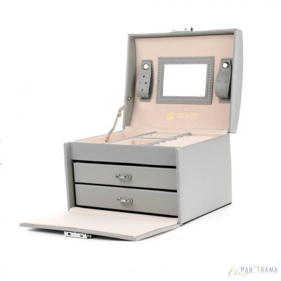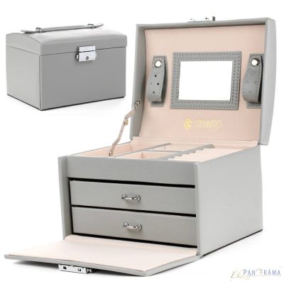 Divatos, minimál stílusú, nőies, több rekeszes, fiókos ékszerdoboz, tükörrel. Zárható.
