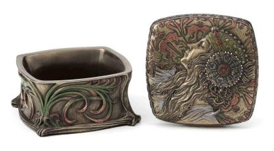 A doboz bronzzal bevont polirezin anyaga tartósságot és klasszikus megjelenést biztosít, ami harmonizálhat bármely enteriőr stílusával. Ez a szelence nemcsak praktikus, de egyedi ajándék is lehet a számodra fontos hölgy ismerősöd számára, aki értékeli a művészetet és a különleges designt. Ha valami igazán különlegessel szeretnéd meglepni, ez az ékszertartó doboz a tökéletes választás.