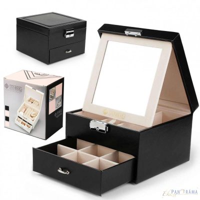 Divatos, minimál stílusú, nőies, több rekeszes ékszerdoboz, tükörrel. Zárható.