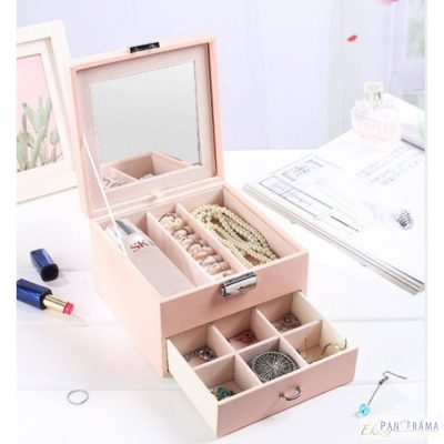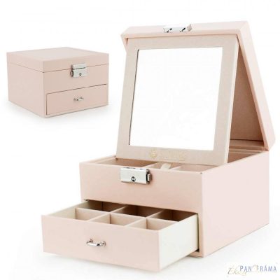 Divatos, minimál stílusú, nőies, több rekeszes ékszerdoboz, tükörrel. Zárható.