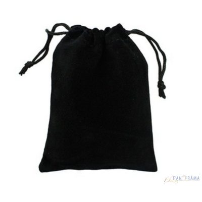 Egyszinű fekete plüss anyagból készült kis ékszertartó zsinóros tasakMérete: 7 x 9 cm