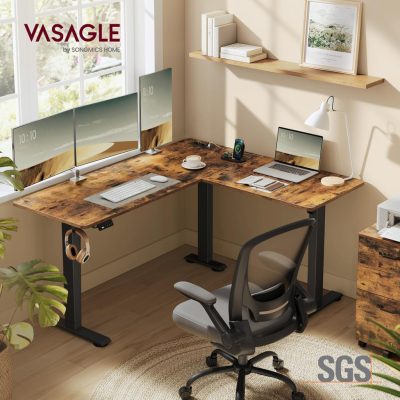 Elektromos magasságállítható L-alakú íróasztal, 140 x 160 cm, beépített töltőállomással, 2 memóriás funkcióval, otthoni irodába, rusztikus barna és fekete színben