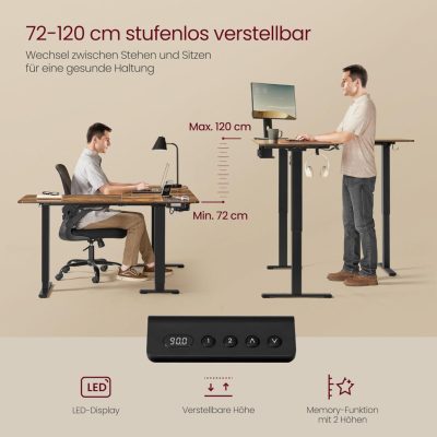 • Ergonomikus és egészséges munkavégzés: A magasság 72–120 cm között állítható, így váltogathat az ülő és álló munka között, csökkentve a hosszan tartó ülés okozta fáradtságot. A 2 memóriás magasságállítás lehetővé teszi a kedvenc pozíciók gyors beállítását.