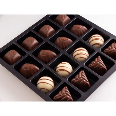 Giandujával töltött tejcsokoládé [tejcsokoládé (%50) (cukor, tejpor, kakaóvaj, kakaópor, kakaómassza, emulgeálószer (napraforgó lecitin), aroma (vanillin)), Gianduja (%50) (cukor, mogyoró (%) 25), tejpor, növényi olaj (pálma), kakaómassza, kakaópor, emulgeálószer (napraforgó lecitin), aroma (vanillin)]. Tejcsokoládé kakaó szárazanyag legalább 33%.