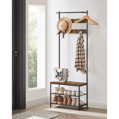 kabáttartó cipőtárolóval, előszobafal, kabáttartó cipőpaddal a folyosóra, 9 mozgatható kampó, felső rúd, 32,2 x 64 x 180 cm, hálószoba, ipari, rusztikus barna és fekete: