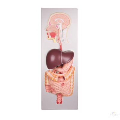 Ez az életnagyságú modell az emberi emésztőrendszert mutatja be a szájüregtől a végbélig. A szájüreg, a garat és a nyelőcső első része a mediális sagittalis sík mentén van feldarabolva. A máj az epehólyaggal együtt látható, és kivehető. Az eltávolítható hasnyálmirigyet és a nyombélnyálkahártyát felboncoljuk, hogy feltárjuk a belső részeket. A gyomor eltávolítható és két részre bontható, a duodenum, a caecum, a vékonybél egy része, a vastagbél és a végbél a belső részek feltárása érdekében felnyitható.