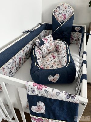 • Emery Belle teljes babaágy szett – 7 részes, farmer és pillangós pamut kollekció bogyós díszítéssel
