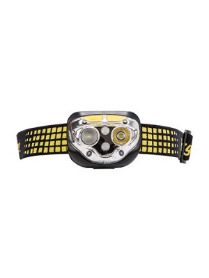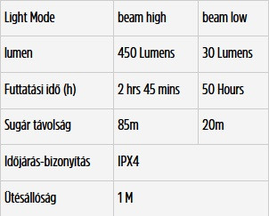 4 LED-es (2 fehér, 1 piros és 1 zöld LED) Fejlámpa. 450 Lumen, 2,75 óra működési idő, Hatótávolság: 85 m, Időjárásálló, 2 féle Éjjellátó, Csuklós fej, 1 m-ig ütésálló. 3 db mikroelemmel működik, ami a csomagolás részét képezi.