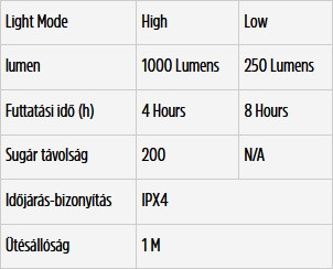 3 LED 1200 Lumen, 4 óra működési idő. Csökkentett mód: 250 Lumen, 8 óra működési idő. 7 világítási mód. Hatótávolság 200m, Ütésálló 1 m-ig, időjárásálló. Újratölthető lítium-ion akkumulátor, Légi járművekhez használt alumíniumból gyártott lámpatest, USB-töltőrendszer, Kiváló érték a gyakori felhasználók számára, Digitális fókusz a pontos fényerősség-szabályozás érdekében, 15-20 évre tervezett élettartam a tipikus használati minták alapján, Könnyű használat.