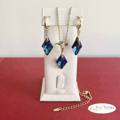 14K Gold Filled nyaklánc és fülbevaló szett eredeti, kék rombusz formájú kristállyal.