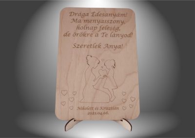 Tedd még meghittebbé a szülőköszöntés pillanatát egy különleges, gravírozott ajándékkal édesanyád számára. Ez a személyes üzenettel készült tábla menyasszonytól anyának szól, és tökéletesen kifejezi a szeretetet, hálát és kötődést. A gravírozott fa ajándék nemcsak gyönyörű dekoráció, hanem örök emlék is marad. Egyedi névvel, dátummal és személyes üzenettel rendelhető, így igazán különlegessé teszi az esküvői szülőköszöntést.
