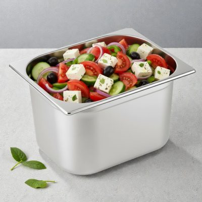 rozsdamentes acélból készült, amely biztosítja a hosszú élettartamot és a korrózióval szembeni ellenállást. Az edény tökéletes választás professzionális konyhák, éttermek és vendéglátóipari egységek számára, ahol nagy mennyiségű ételek tárolására, előkészítésére és felszolgálására van szükség. A sima felület könnyen tisztítható, biztosítva a higiénikus használatot. Kompatibilis a GN szabványú rendszerekkel, így könnyen beilleszthető a konyhai folyamatokba, és hozzájárul a hatékony munkavégzéshez.