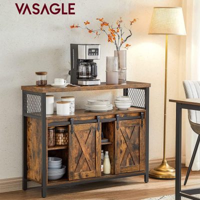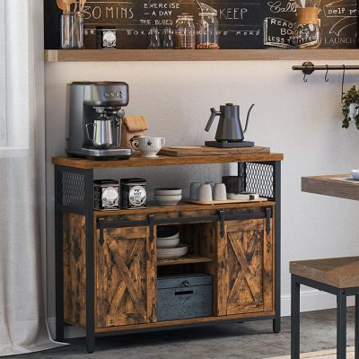 Étkező szekrény, konyhai szekrény, tároló szekrény, büféasztal toló pajtaajtókkal, állítható polc, ipari, nappali, rusztikus barna és fekete