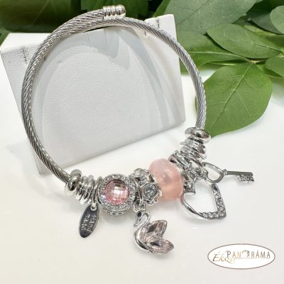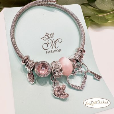 Ezüst színű divatos karkötő rugós alappal, trendi motívumokkal.