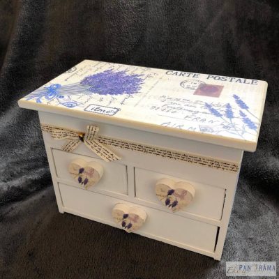Levendula mintás fa ékszertartó ládika, tetejében tükörrel, az alsó része 3 fiókra osztott!